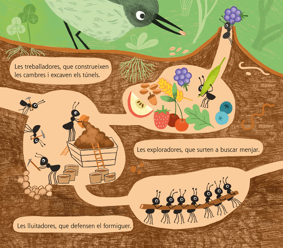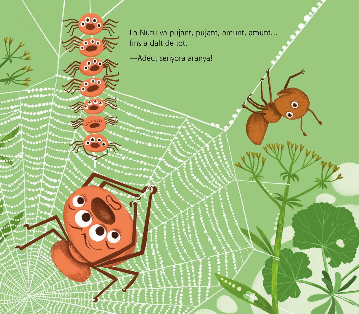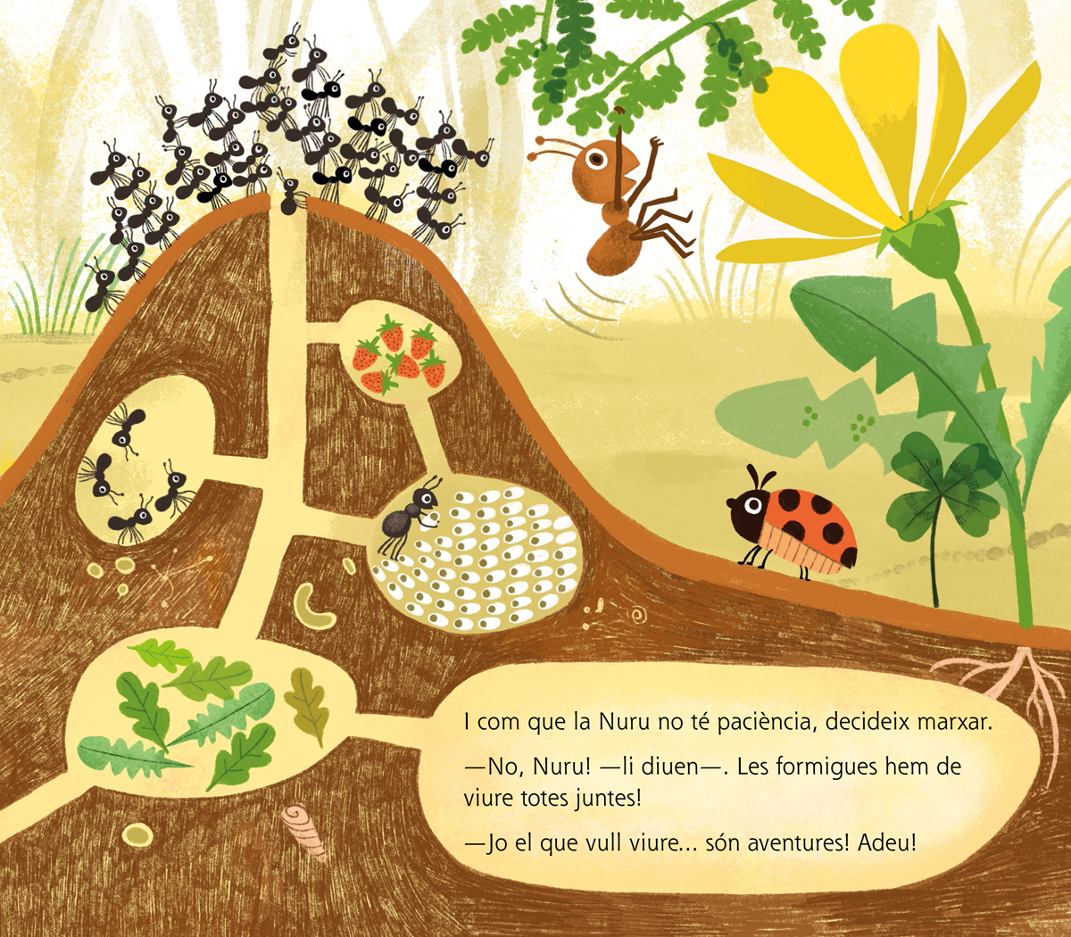 Totes les formigues saben quin és el seu lloc: unes excaven túnels, unes busquen menjar, d’altres defensen el formiguer. Totes segueixen el mateix ritme. Totes…menys la Nuru. Diuen que les formigues han de viure juntes. Però la Nuru el que vol és viure…aventures!