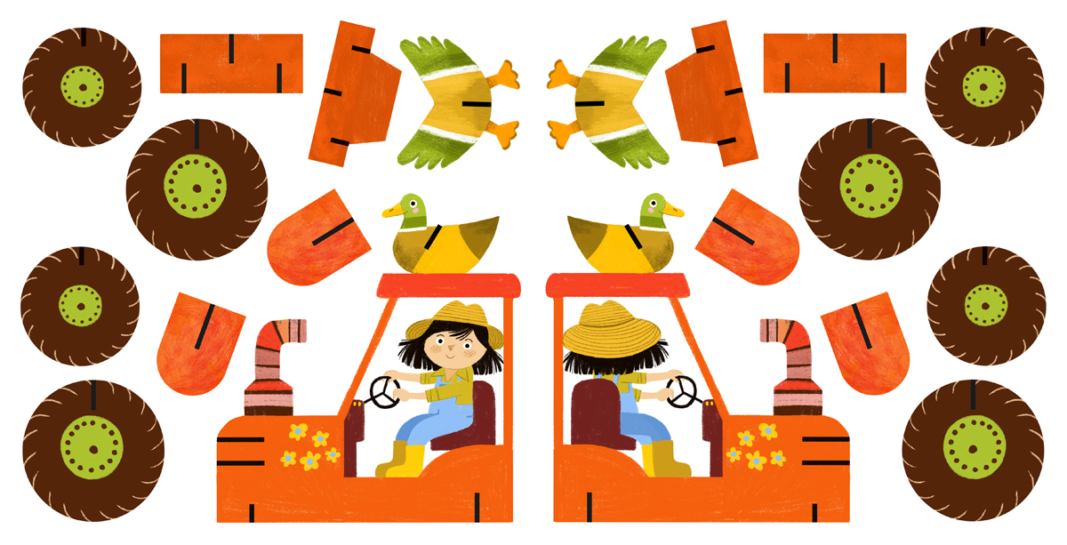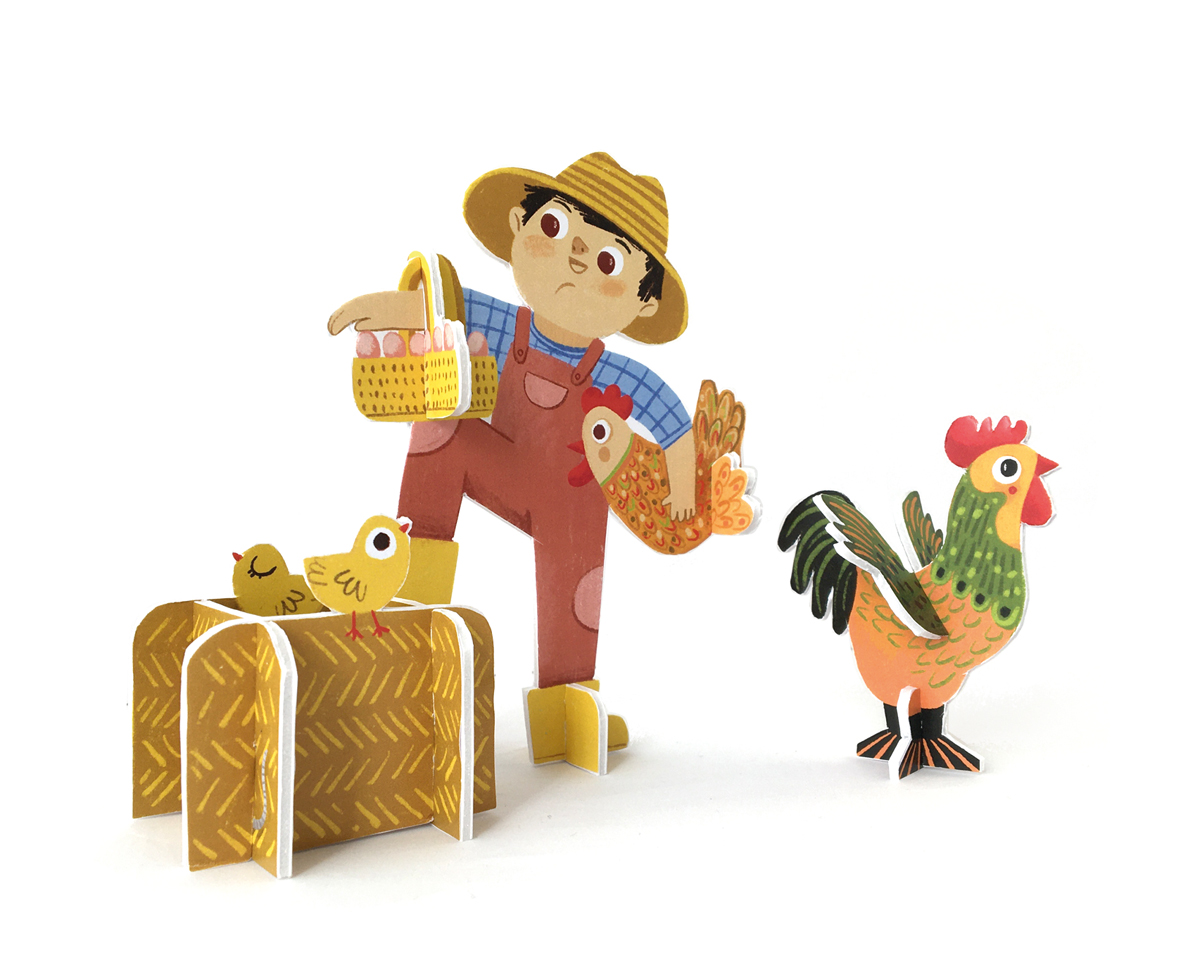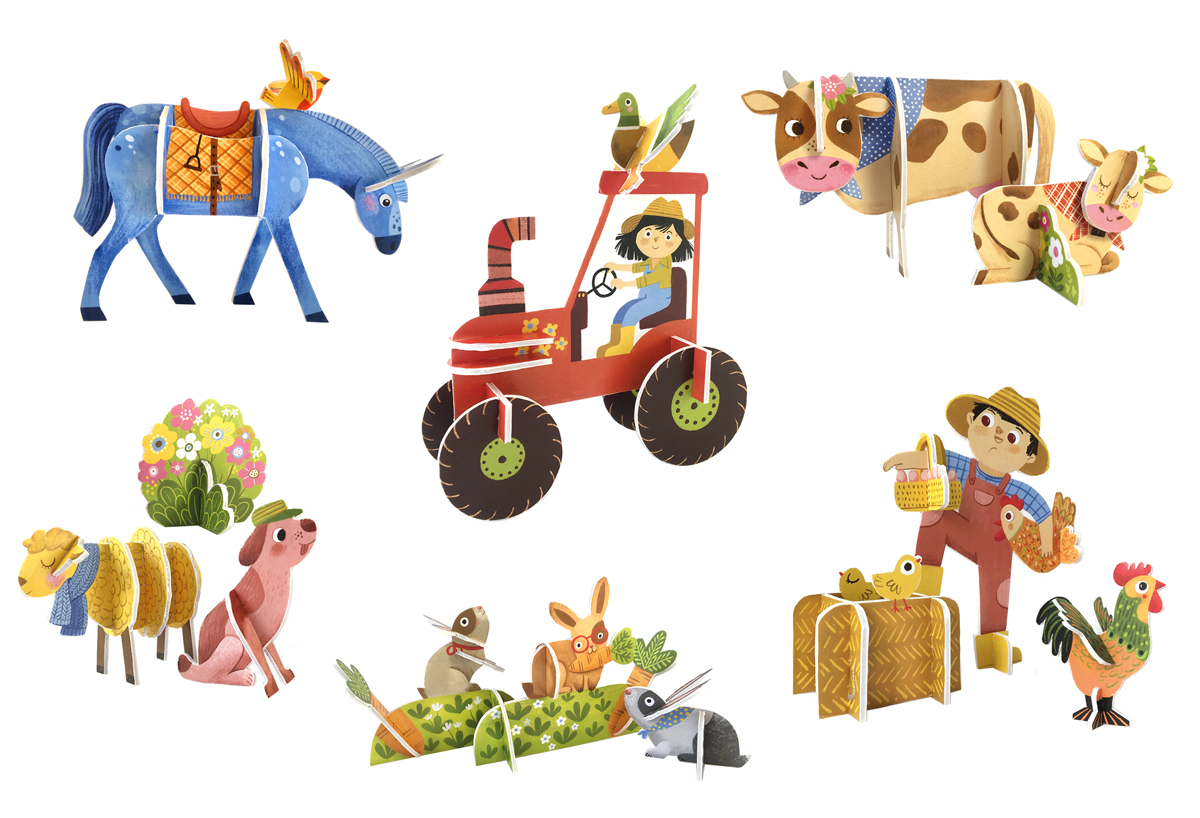 En aquesta caixa trobareu un llibre per saber quina feina fan els grangers i com viuen els animalets a la granja i, a més, peces per construir 6 escenes molt especials: El galliner, La vaca amb el seu vedell, El Cavall, L’ovella i el gos pastor, Els conills de l’horta i El tractor.
