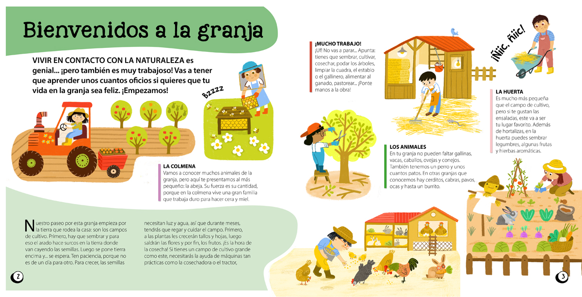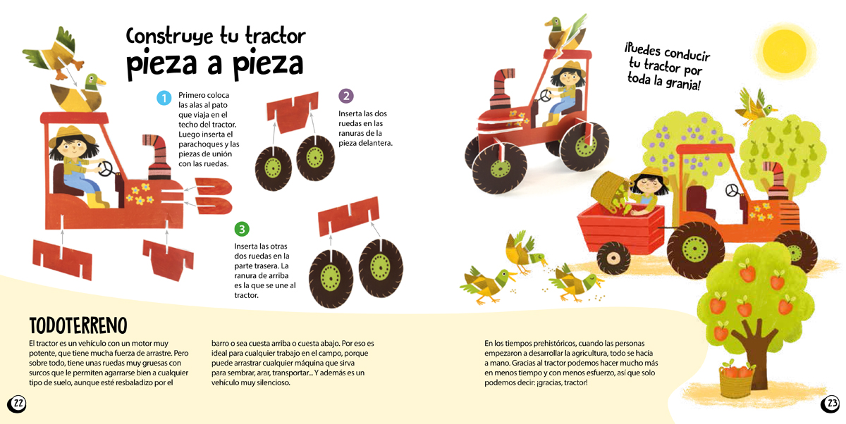 En esta caja vais a encontrar un libro para saber qué trabajo hacen los granjeros y cómo viven los animalitos en la granja y, además, piezas para construir 6 escenas muy especiales: El gallinero, La vaca con su ternero, El Caballo, La oveja y el perro pastor, Los conejos de la huerta y El tractor.